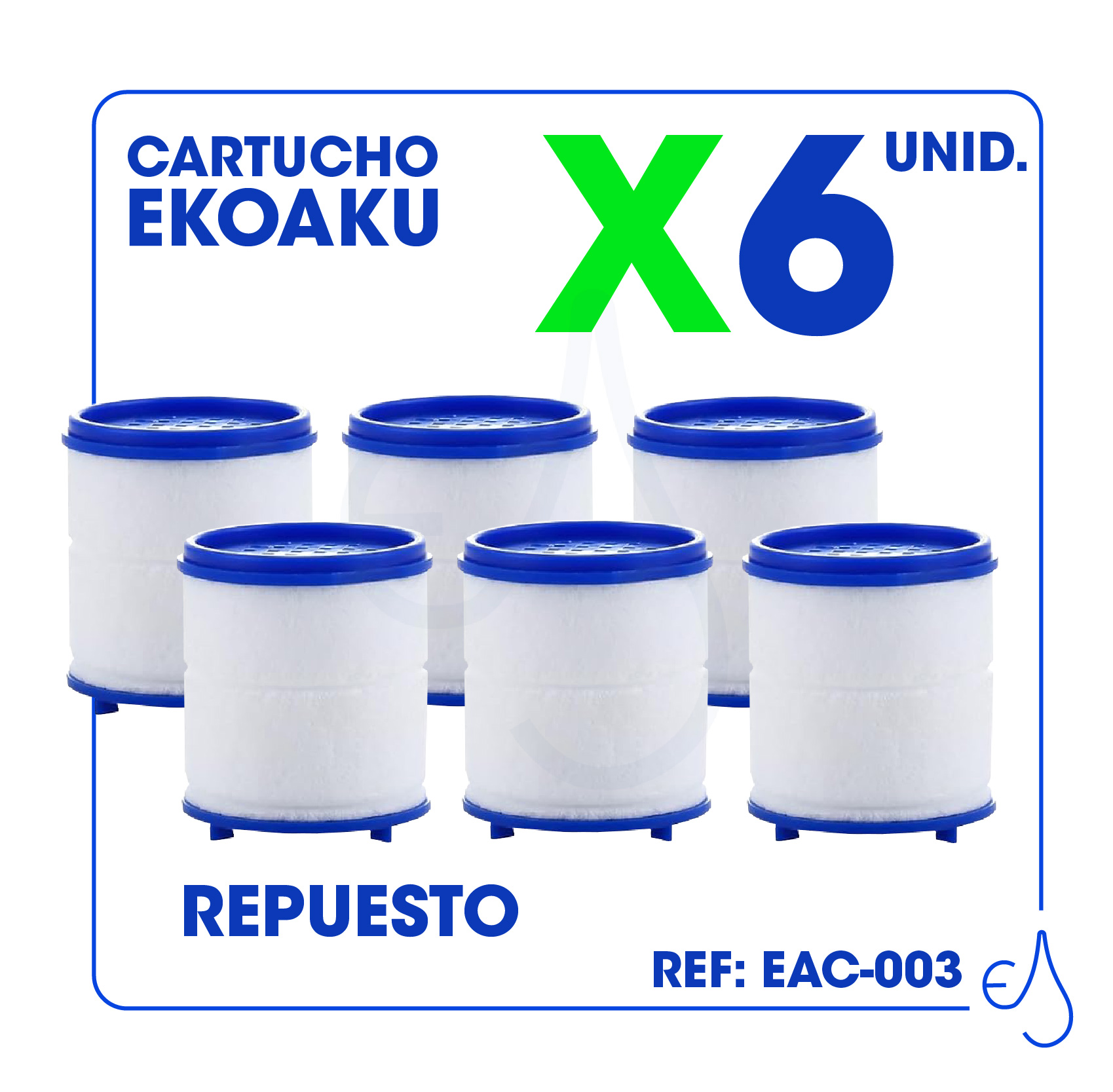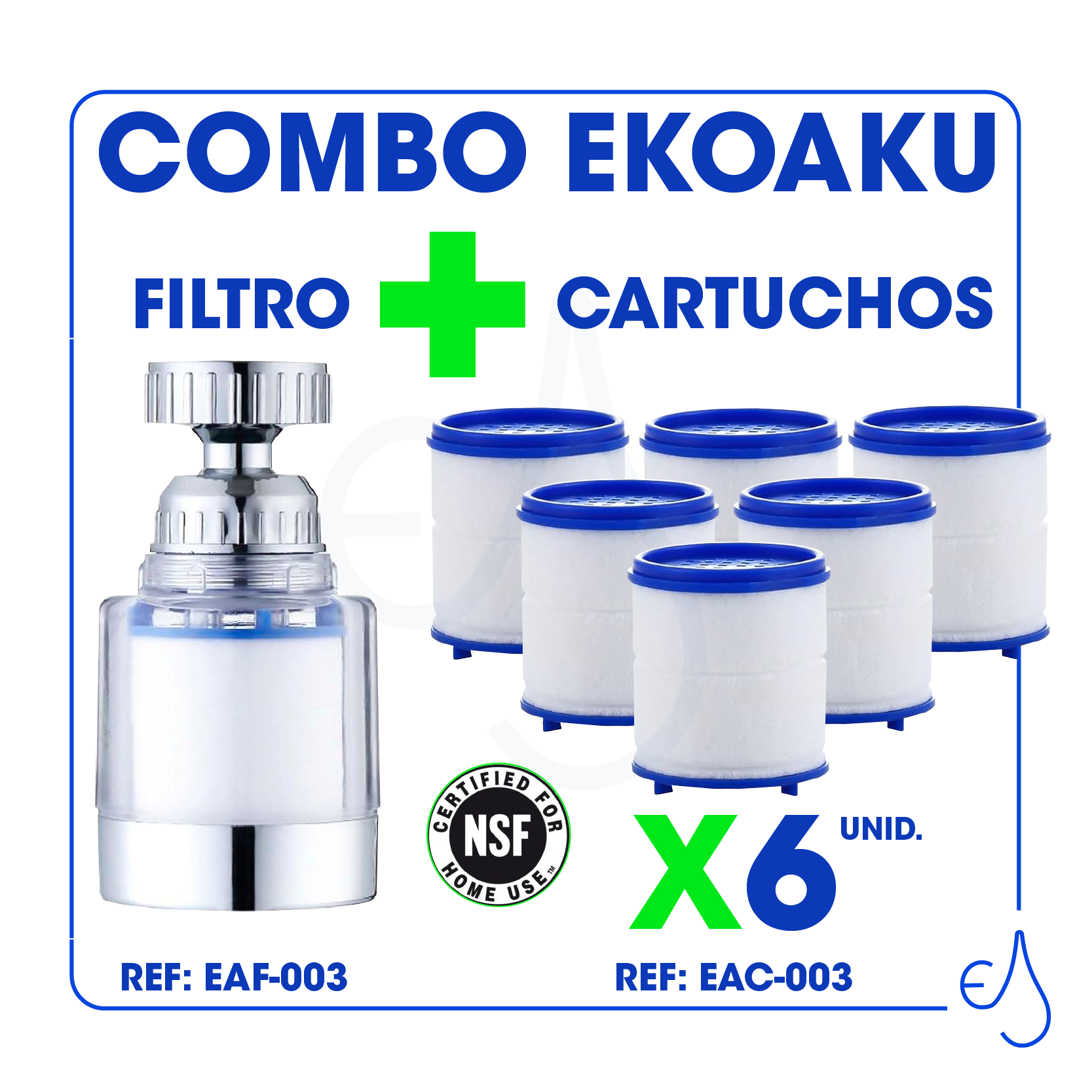 El filtro EAF-003 mejora la presión y rendimiento del agua, mientras que los 6 cartuchos EAC-003 aseguran hasta 6000 litros de agua purificada, eliminando sedimentos y cloro. Fácil de instalar y compatible con grifos estándar.